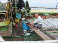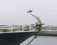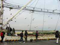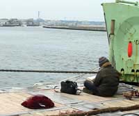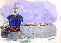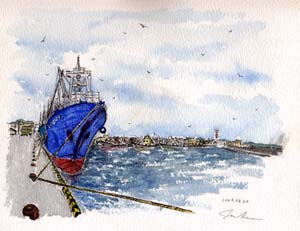 8時からの朝食には、納豆、魚の塩焼き、湯豆腐、生卵、海苔などなど醤油の似合う品々が並ぶ。今日は、銚子の漁港を描く予定。まだ冷たさが残る潮風に備えてご飯をたくさん食べておかなければ。写真塾の人達とはここから別行動、我々は、バスに乗って港へ向かった。漁港に着くとしばらくスケッチポイントを探しながら港を歩く。天気は薄曇りで昨日より寒い。時には外国まで出かけるという漁船がずらりと並ぶ。船の上では船員さんがアジを裁いていた。時々後ろにほおり投げている。するとそれをねらってたくさんのカモメが集まってくる。別の船には、長さ500メートルもあるという網が山のように積み上げられている。その網の破れた部分を漁師さんが修理していた。気の遠くなる作業だ。皆が描き始めたのは10時半過ぎたころ。僕も鮮やかな漁船の緑色に魅かれてポイント決定。時間が経つに従って潮風の冷たさが身に染みてくる。ようやく描き上げたのは12時15分。体が芯まで冷えきってしまった。