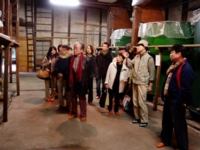 最初に訪れたのは馬場本店酒造。大きなレンガ製煙突が印象的だ。煙突は明治時代に一種のステータスシンボルのような役割をしていたらしい。敷地内には天保三年に作られた土蔵もあり、その中には巨大な酒樽が何個も立ち並んでいる。中には近年まで使用されていた地杉を使用した三十石樽もあった。(三十石がどれくらい凄いかというと、一人の人が一年間に食べるお米の分量が一石だから、その30倍。んーイマイチ凄さがわからないかなぁ。とにかく大きいのだ)更に奥に進み製麹室(通称ムロ)まで見せてもらう。最後にお酒&ミリンの試飲もさせてくれた。有難うございました。