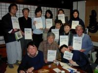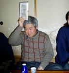 6時過ぎにスケッチを切り上げて温かい夕飯が待つ宿に戻った。空腹は最高の調味料とは良く言ったものだ。勢い余って三膳も食べてしまった。ここで気掛かりな事実が判明。今回参加予定の太田さんとの連絡が取れなくなっていると言うのだ。最初の頃は夕飯までには着くと言ってたらしいのだが…。とは言うものの食欲には勝てず、危うく彼の分まで食べそうになってしまった。さて塾長はと言えば、調子よくオチョウシを何本も空けており既に赤ら顔。大丈夫か? 場所を二階の8畳に移し講評会になった。今回お世話になった小森さん(佐原商工会議所)、小出さんにも参加してもらった。それにしてもみんな雨の中よく描いた。講評会は修了証授与式となりやがて飲み会へ移行。ギターを弾いたり、ハーモニカを吹いたり、風呂屋に行ったり。そうこうしている内に太田さん到着。美術塾事務局も一安心。彼の夕飯も無事。こうして佐原の夜はふけていった。