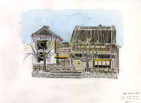 さあさあ、ここからがツアーの目玉のスケッチタイム。しかし時刻はこの時点ですでに3時をまわっていた。みんな自分のスケッチポイントに散らばって行った。さてボクはというと、最近個人的に「神様」ブームなので寺社仏閣気分なので、観光マップの下の方に載っていた観福寺に行くことにした。ただボクがあまりにも自信あり気に「観福寺!真言宗!仏」と連呼したため、魚谷純子さん、草道さん、田中丸さんも一緒に行くことになった。これでショボかったらどうしよう‥。不安と期待を胸に、いざ観福寺。これがけっこう遠かった。地図の上ではすぐなのに‥。途中、道の誤りを指摘されつつようやく辿着いた。三門をくぐるとそこはなだらかな上り坂になった杉並木。肝心のお寺はというと、なかなか立派な本堂だ。ただ絵を描く場所は、どうやらなさそうだ。一応境内を散策するも、やっぱり描く場所がない。各自小さめの絵を一枚描いて、結局田中丸さんを残して山を下りることにした。三人は伊能忠敬の生家の軒を借りて中村屋を描く事にした。しかし身体の芯から冷えた。それもそのはず。この日、東京では雪が降ったそうだ。もう暗くなって、色は見えないし、寒いし、お腹は減るし。グスン。