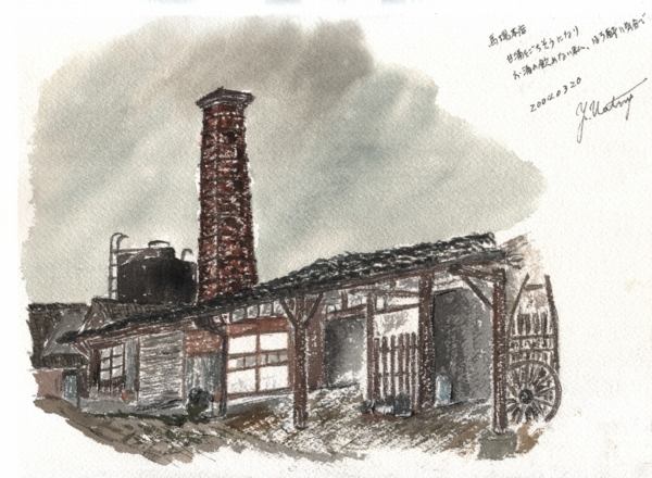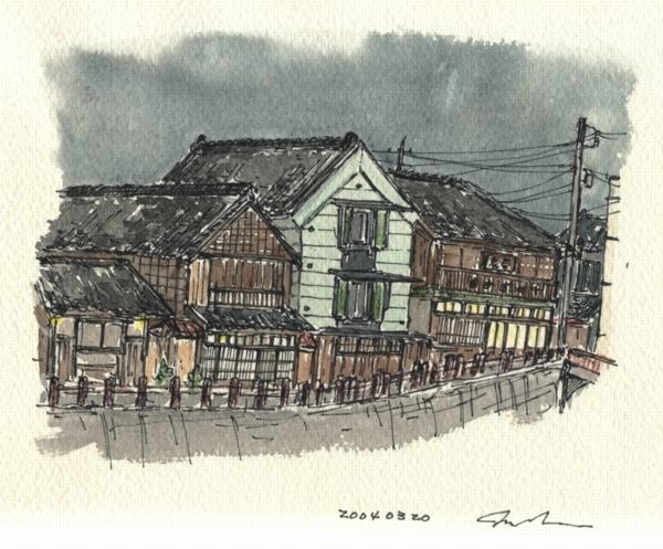 2004年3月20日から21日にかけて第四期神楽坂美術塾の佐原一泊スケッチ会が行われました。佐原市は千葉県の北東に位置し、茨城県との県境に接しています。市内を流れる小野川沿いは重要伝統的建造物群保存地区(重伝建)に指定されており、江戸・明治期の建物が今なお数多く残る魅力溢れる町です。今回の小旅行には塾長以下16名が参加しました。 文・酒井草平 ■3月20日 集合は佐原駅南口に12時。天気はあいにくの雨。しかも凍てつくほど寒いときた。一行は雨の中、旅館に向けて出発。車で来た川崎さんと小澤さんは一足先に旅館へ。残りの人達は徒歩で宿に向かった。途中、千葉県建築文化賞を受賞した「しゅはり本店」を見学。ゆっくり歩きながら今回の宿である木の下旅館に到着。ここは小野川沿いの重伝建地区に位置しており、なんでも昔船宿をやっていたそうで、佐原で一番古い旅館だそうだ。建物は木造2階建、玄関にあるコケシのコレクションが印象的だ。荷物を置き佐原の町歩きスタート。今回のツアーをコーディネートしてくれた魚谷幸子さんに先導され佐原の町へ。