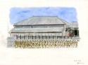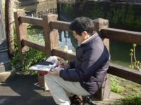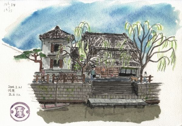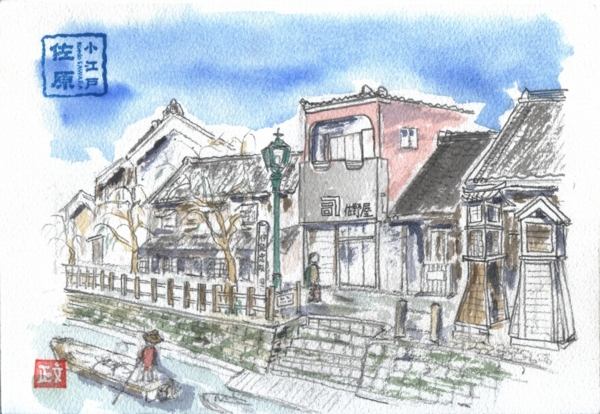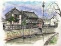 朝飯前から頑張ったのでお腹はぺこぺこ。もりもり食べた。シャケが旨い!温泉卵が旨い!お腹いっぱい。食事が終わると、スケッチに出る人、なぜかストレッチ体操を始める人、15分睡眠をとる人等々、みんな自分のペースで二日目の佐原を楽しんだ。とにかく、今日はもう東京に帰らなくてはいけないのだ。ボクは遠山の元さんと共に水門へ向かった。小野川をずんずん下る。道路を越えてもまだ下る。線路を越えてもまだ下る。ボクは挫折してしまった。それでも元さんは初志貫徹、水門目指してずんずんいってしまった。ボクはと言えば、青空の下、遠ざかる元さんの背中をしばし眺て、もと来た道を引き返すことにした。ここはやっぱ正上か。戻るとそこでは既に数人の塾生が絵筆を走らせていた。ボクはただでさえ筆が遅いのにすでに後れを取っている。気が焦るばかりだ。構図を考えるも、ええい、ここは正面突破だ。川を挟んで正上を正面から描く事にした。当たり前だがやっぱり天気が良いと描いてて気持ちが良い。鼻歌交じりでスケッチ。