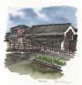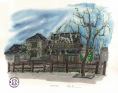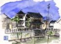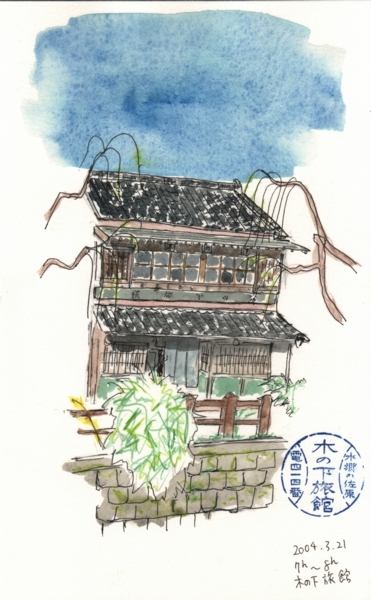 ■3月21日 スケッチ会二日目の朝は早い。前日のスケッチが仕上がっていたため、ただ己のスケッチ欲を充たすため、はたまた前日怠けたのを取り戻すため、その理由は様々である。早い人は6時前から起きてたらしい。そう言えば昨晩、塾頭・岡田さんは「三枚描く!」と豪語していたなぁ。ボクも6時半に起き、朝飯前に一枚描こうと外に出た。外はといえば昨日の悪天候とはうって変わって快晴。しかし空が晴れている分、冷え込みは昨日よりひどいようだ。何もしていなくとも指先がじんじんしてきた。宿の周りを一回りしたが、ここはやはりお世話になった木の下旅館だ、とうことで対岸から旅館をを描くことにした。しばらく描くと指先の感覚が無くなってきた。すっかり冷えきった体で宿へ。