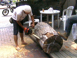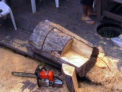 ジープからチェーンソーを取り出してきた彼の手によること約1時間。パウワウの林さんと約束していた原始的なイスがあっというまにできあがってしまった。
