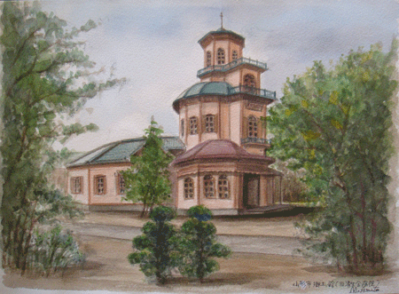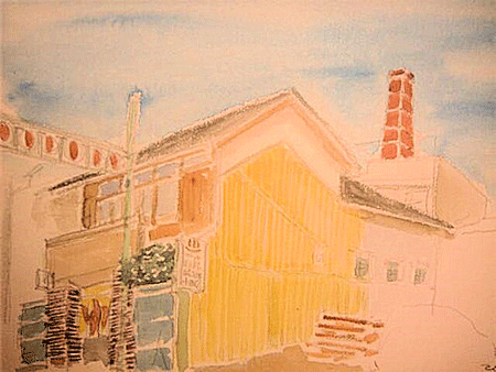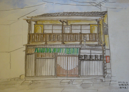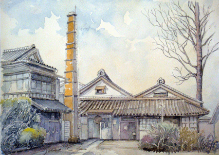 散歩中偶然に発見した。現在は「そば琳」という看板を出し、元旅行会社添乗員のオジさんが蕎麦屋を営んでいる。スケッチしていたら、話し掛けて来てくれて、今ではすっかり仲良し。山形に住む面白い人たちを沢山紹介してくれた。この作品の額も彼が紹介してくれた古民具屋さんで買った品物。 |