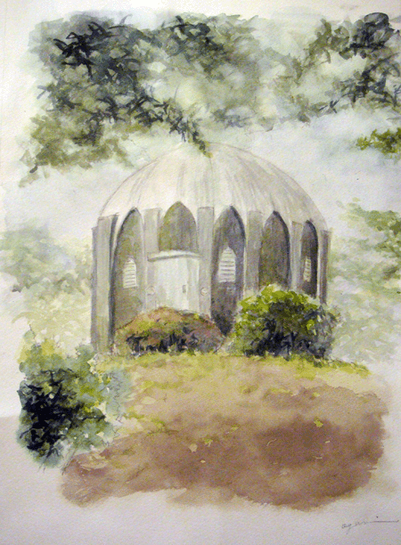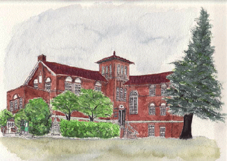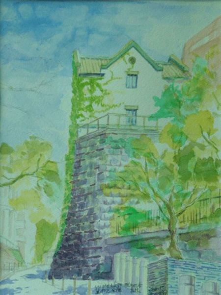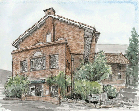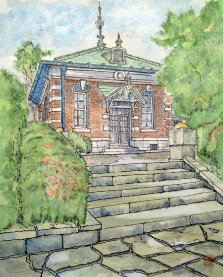 5月22日のスケッチ会の日、雨が心配されていたので、軒が出ている下に場所を選んで、描き始めました。それが、建物に近すぎて、パースを整えるのにとっても苦労してしまいました。さらに近いだけにディテールがよく見え、イギリス積みで積まれているレンガが、部分部分で積み方を変えて意匠的なアクセントにしているとことなど、はしょらずに描こうと鉛筆を入れはじめて後に引けず、完成前に雨が降りはじめて色鉛筆を入れた段階で中断してしまいました。後日水彩を追加して、仕上げたものです。
