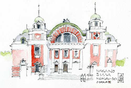 暑い日のこと、スケッチをする前にひとっ風呂。熱い湯に入った後に描く銭湯はまるでさわやかなレモン水のように見えた。