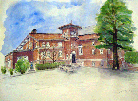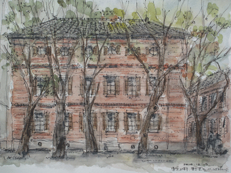 上野の山、東京藝大の構内に建つ赤レンガ2号館です。明治中期に建てられたレンガ造の建築です。当初は東京図書館書籍庫として使用され多くの蔵書があったようです。そのためか、すべての窓に鉄扉が取り付けてあります。重厚で堂々とした建築で、描くこちらの絵筆にも力がこもります。