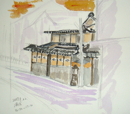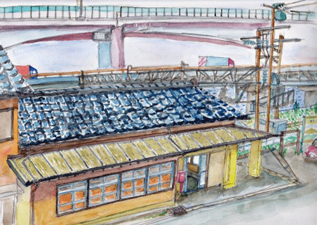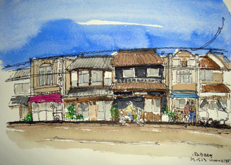 かつてはとても賑やかだったと、この街で育ったというおばさまが誇らしげに話しかけてきてくれた。スケッチには描かなかったが、解体のお知らせが出ていた。多くの散策者が足を止めていた。どうにもらならないことなのか、ひっそりした最期に居合わせた。とにかくこの姿を書きとめておかなくては、と黙々とスケッチを進めた。それとはうらはらに、元気な小学生たちが寄ってきたり、引戸の音や話し声、人の臭いのする街だった。