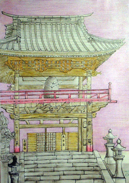 街道から奥に入ったところに目立たず静かに建っています。本堂は1765年に建立され、この鐘つき堂は百年後の1865年に建立されました。冬は可成りの積雪がありますが左右6本の柱で屋根と鐘を支え、今も変わらず使われています。