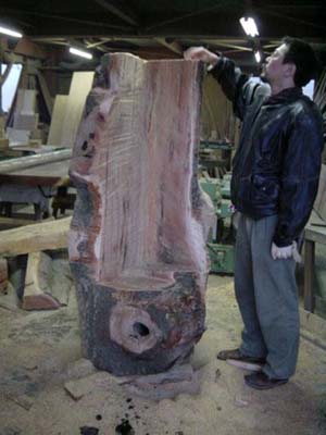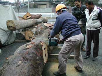 ベンチの丸太に安藤さんのチェーンソーがはいったところ。 |