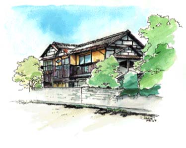 ぽっかりと梅雨晴れの空、和風の建物に不釣り合いに思える飾り窓が気に入って、裏手にもかかわらずペンを引いた。平穏の中の洒落た動き、懐古へ導くその形、私に小さな幻をほんの一時見せてくれる。