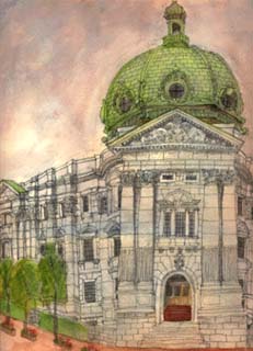 横浜には「横浜をスケッチする会」と言う会があり、多くの人達が学んでいる様です。目ぼしい建築物の前や場所には、何時も2、3人の人がスケッチしています。セミプロと思われる程上手で、其の中にまじって描く事は、随分と勇気が必要です。 かつて大林組東京支店に勤務しておりました。其処に、妻木さんと仰る東大の学生さんが人事課長さんを訪ねてよく見えたのです。大変な美男子で社内でも評判になっておりました。もしかしたら、妻木頼黄さんの縁りの方ではなかったかと思えて、此の建物に親しみを覚えました。 |