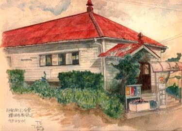 “ひっそりとではあるが地域に生き続けている建築、それも出来るだけ身近な所で”というのが今回の私のテーマ。川和町自治会長の城所さんは、かつてこの分教場で学び、その頃は広い廊下を皆んなでピカピカに磨いたそうだ。柱も教室の窓枠も屋内のものはそのまま使われている。土台も天井もしっかりしていて、今これだけの建物を建てられる大工さんはなかなか居ないとの事だ。 “この公会堂を描いてくれるなんてうれしいな――”という城所さんの一言に、この土地に生き、いとおしみながら大切に使い続けている人々と、この公会堂の姿がダブって、心暖まる嬉しい思いがした。 |
