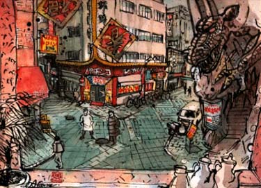 中国茶店の窓越しに見下ろす。ここは池袋の一角。無国籍で猥雑で、どこかしら犯罪の臭いまで、むわーんと漂っている。 さっきからずっと立っている中央の男が別の男に何か手渡した。人影はまばらだが、正面のパチンコ屋だけがわずかに活動している。まだ日が高いため、この街の本領は発揮されないようだ。夜の闇と共にうごめく邪悪なドラゴンも今は眠っているままだ。 |