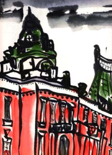 | 私と名古屋市市政資料館との出会いは、友人が平成8年春に、この資料館にて絵手紙展開催、その時に訪れて初めて当館を知りました。極彩色(特に朱)の建造物に魅せられていた私はこんな身近にわが国の代表的な洋風建築が重厚に存在しているのに感動、それ以来再三スケッチに訪れています。今回は規定がF4サイズまでなので、今年6月18日(第三木曜休館でした)に又描きに来ました。 |