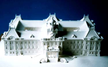 霞が関の、通称赤レンガと呼ばれるている旧法務省を始めとして、旧司法省関係の建物にはレンガ造りが多いようだ。この「旧名古屋控訴院地方裁判所区裁判所庁舎」も、中央にドーム形の塔屋をいただく華麗なレンガ造りで、国の重要文化財建築である。 今年のスケッチ展は正にこの建物の中で開催されるという。明治・大正の西洋館を作っている私としては、是非ともこのレンガ造りのミニチュアを出品しなければならない。5月の連休を利用して取材に出かけた。赤いレンガと白い花崗岩の組み合わせが綺麗な外観もさることながら、正面入口を入って目にする脈理の模様も美しい大理石の階段と円柱は見る人を圧倒する堂々としたもので、一昨年訪れたイングランドのホルカム・ホールを思い出したことであった。 撮ってきた写真と資料館から頂いた図面とを首っ引きで制作したのだが、統一されていながらも各面で変化の妙をみせるファサードとパラペットは、実際に作ってみないと判らないかも知れない。「急ぎ働き」の誹りを受けそうな箇所もあり、少々反省しているのだが・・・ |