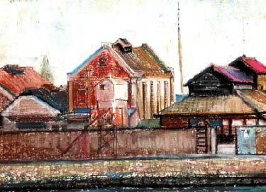 私はレンガ造りの建物や擬洋風建築のエキゾチックな建物に興味があり、時々、スケッチをかねて探し歩くことがあります。 このスケッチは、三河湾の大浜漁港の市場と並んでいる貯氷庫です。赤茶けたレンガの壁と屋根は、かなり古いものゝようで、大正の頃に建てられたと考えられています。 これは夏の暑い日射しの中で、時間を忘れて描いた、その時の一枚です。 |