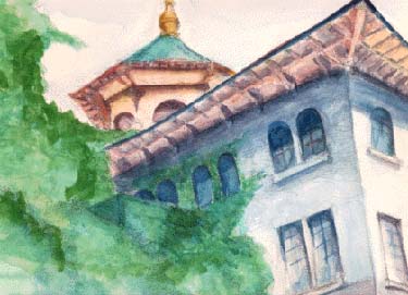 私の生まれ育った家は、高台にあり、2階のベランダからいつもこの建物を眺めていた。いささか過ぎた空想癖を持っていた幼い私は、鬱蒼とした緑の中に埋もれるように建つその塔の中で、大好きだった童話に出てくる「魔法使いに呪いをかけられて囚われになった姫君」が窓辺に座って王子様を待っているような気がして、ワクワク、ドキドキしたものだった。 時が経ち、姫君に憧れた田舎の少女は、いつしか剣を手にして王子様と共に闘うようなタフな女になってしまったが、今もこの建物を見る度に、なんだかいとおしく、懐かしい気持ちになるのだ。 |