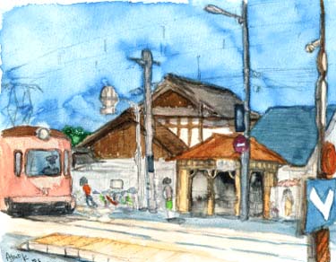 大正4年に開発された大阪の住宅地「帝塚山」。ここには大阪市内にわずかに残された路面電車が、住民の貴重な足として今日も元気に走っている。 明治33年の開通当初は馬車鉄道だった。その姫松駅の待合い所は時代の流れとともに切符売り場が撤去されたりしたものの、今も乗客の陽射しや雨よけに使われている。またその後ろにそびえ立つM医院の邸宅は、作った先々代が普請道楽と異名のつく人だけあって、とても丁寧に頑丈に作られている。近くの人からは「室戸台風でも瓦一枚飛ばなかった。」なんて半ば呆れられている。 私はここでチンチン!音をたてて走っていく路面電車を見るのが大好きなのです。 |