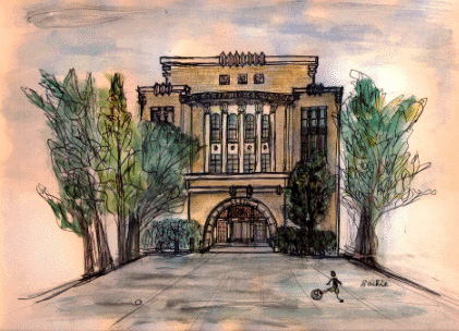 この講堂の屋上で、同窓である元首相海部俊樹がつくった弁論部に入っていた黒川紀章は、のどから血が出るくらい熱心に発声練習を行ったという。屋上へは上がれなくなったが、現在も講堂として使用されている。スケッチした当日は暑い日であったが、クラブ活動等で熱心に練習する生徒たちが出入りしていた。 設計/(顧問・土屋純一)酒井 勝、大脇 勲、宮川只一 |