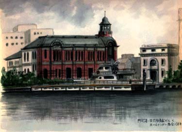 関門海峡に面し、古くから大陸貿易で盛んだった九州の玄関口・門司港には、今も往時を偲ばせる洋館がそこかしこに立並んでいる。 内港に面して建つ旧大阪商船ビル(1918年・大正7年建造)は、かつて大連など大陸航路の窓口となり、多くの旅人を送りだした建物で、八角形の塔と煉瓦造の色彩が街の風景に溶け込んでいる。右隣りにあるホームリンガー商会は、明治維新の頃、年若き会津藩士だった私の祖父が、戊申戦争で鶴ケ城落城の後、単身九州に渡り、このホームリンガー商会で貿易の修業をしたという、我が家にも因縁の深い建物なので、ついでに並べて描いてみた。 |