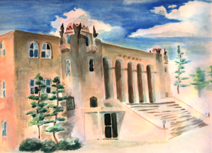 一枚目のスケッチの対象がスケッチの途中で取り壊されてしまい、8月に入ってからこの絵を描き始めました。暑い、というより熱い、盆休みに入ってからは車も人通りも少なく、セミの鳴き声と甲子園のラジオ中継をBGMに、公会堂と自分の一対一の空間で、暑さとたたかいながら描きました。