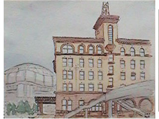 設計は大阪市建築課・新名種夫。新名自身が建築家武田五一の指導を仰いだと回想しているように、武田が好きなモチーフが随所に見られる貴重な建物。だがすでに建替えが決まっており、今回の主題に選んだ。市電や市営地下鉄に武田は大きく関与し、交通局とは切っても切れない存在だったが、すでにそれも忘れられている。すぐ裏には大阪ドームの銀色に輝く屋根が見え、スケッチをしている間、あたかもこのドーム怪獣に呑み込まれる寸前という気がしてならなかった。 |