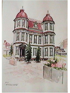 図書館というにはあまりにも立派なおしゃれな建物である。赤い屋根に緑の上げ下げ窓、アンチックな家具、少女時代憧れた小さなお城だ。周囲に森がないのがちょっと残念、そんなことを考えていたら一枚目のスケッチは手前の緑と花ばかりが目だってお城がかすんでしまった。これではこれを建てた棟梁、堀江佐吉氏に申し訳ない。 |
