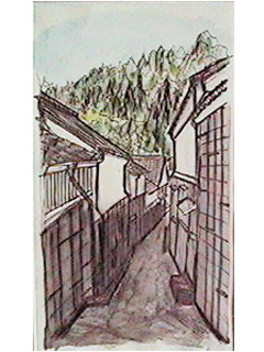 足助は、かつては岡崎方面から信州方面に通じる中馬街道、別名「塩の道」の中継宿場として栄えた町である。当時の面影を残す町並みの中ほどにこの「マンリン小路」がある。この小路にたたずんでいると、まるで近世か近代にタイムスリップしてしまう感がある。スケッチをしながら、当時の様子を想像し、なんとなくほっとしたような、なつかしい感じを抱いた。いつまでも残しておきたい町並みの一つである。 |