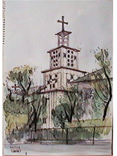 建築主と設計者の考えが相容れないという事態はできれば避けたいものだが(とは言え、日常の仕事の中で私も時たま体験する事だが)、自伝を読むと聖パトリック教会の時のレーモンドがそうだったらしい。そんないきさつのある建築の出来はどうだったのか、実際に見てみたいと思い出かけた。 全体のプロポーションがすばらしく、空間の構造や材料、内部空間の雰囲気や家具にレーモンドらしさが見られた。だが、打放しコンクリートの外壁は塗装され、沢山ある小さな開口部は色硝子に置き換えられ、内外部とも落ち着きが失われていた。 |