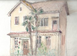 伊能忠敬の旧家の、川を挟んで対面にある、洋風家屋です。昭和初期の建物ではないでしょうか。洋風長屋という感じですが、隣は取り壊されたのか、空き地でした。簡素な建物ですが、窓や、壁のちょっとした装飾が気が利いており、わずかなスペースに植えられた花木(棕櫚や薔薇)とも調和して、良い感じを受けました。 |