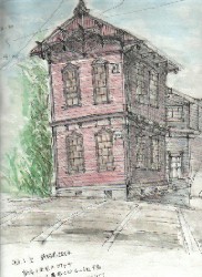 年末年始、久しぶりに帰郷。スケッチポイントを探して歩く。数少ない近代建築の中の「細幅会館」を描く。明治期の軍服のベルト工場の名残り。大通りから入ったところに佇んでいる。「駅前開発より、こちらの方が先でしょう」とつぶやきながら、一時間程。郷里の「良い所」探しは楽しくもあり、歯がゆくもある。 |