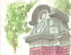 京都の岡崎公園はさながら建築博物館のようだ。そのなかで近年、府立図書館(武田五一設計)が失われたのは大きな損失だ。しかしまだ武田が手がけたものがひっそりと野球場の横に佇んでいる。大正4年の京都博覧会で会場に置かれた門柱だ。当時はこの上に電燈が取り付けられていた。それにしても何の説明書きもなく置かれている状態では、スケッチする私が不思議そうに見られてもしかたないだろう。末永く残されることを祈って……。 |