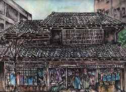 千葉県船橋市本町通りを隔てて向かい合って2軒の古い町屋がコンクリートの建物の間に目を引いております。森田呉服店と乾物屋の廣瀬商店です。両店共、江戸時代よりの創業で火災で焼失して、今回スケッチした森田呉服店は明治初期に、廣瀬商店は大正初期に再建され(廣瀬商店現在のご店主の話)今も現役で営業しております。外観を飾る格子は江戸中期に考案され普及した近世町屋の意匠です。 |