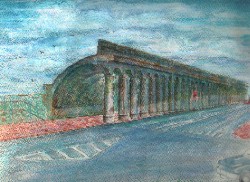 この防波堤は、戦前稚内〜樺太との定期船発着所として築設されたもので、アーチ型構造物として立案され、昭和6年に着工し昭和11年に完成したものだが、激浪のため老朽が進み(第二次世界大戦時の傷跡も多く残っていたとか)昭和53年より55年で改良施工が行われた。古代ローマの柱廊を思わせる独特の外観から通称「ドーム」と呼ばれ親しまれ、世界で唯一の形式のドーム型防波堤である。 |