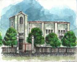 米子市旧水源地。今は米子市水道博物館となっている。中国山地を源とする日野川河川敷にある。 スケッチに行った日は土曜日だったため、隣接する水道局にも人影はなく、ひっそりとしていた。 水源地の建物スケッチは2度目だが、上水道がひかれることを、人々はどんなに喜び、希望をもってむかえたことかと思う。蛇口をひねれば水が出ることに、あらためて感謝。