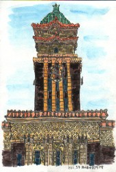 名古屋市役所はとても大きな建物です。 ぼくは全体が入るように画きたかったけど、スケッチブックが小さいし、ぼくの集中力が長く続かないので、一番特徴的な時計塔部分を中心に、真正面から画きました。今回気づいたことは、普段この建物をよく見ていなかった。ということです。庇の下や窓と窓の間、瓦の形がこんなふうになってたんだ。と気づきました。
