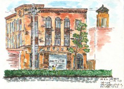 名古屋駅の近くに建っていた「マンツネ」です。何を販売しているのか分かりませんが、1年程前に壊され、今は新築になりました。印象的なのは、黄土色の外壁タイル、円形の窓。屋上立ち上がり部分の丸い装飾です。スケッチ日は真夏で、日影を移動しながら画いたことを覚えています。中を見学したかったけど、日曜日なので入れず、いつかは入ろうと思っていたら、いつの間にか建てかえられていました。残念。 |