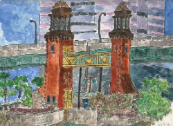 松重閘門は名古屋駅から自転車で5〜10分程走った所に建っています。閘門の前は運河になっていて、材木がたくさん浮かんでいます。夜はライトアップされ、松重自身が闇にポッカリ浮かび、とてもきれいです。水面に反射した松重も格別です。松重閘門は、かなり老朽化が進んでいます。壁面は水あかで黒くにごり、モルタルは剥がれてボロボロです。でも私はそんな所も好きです。 |