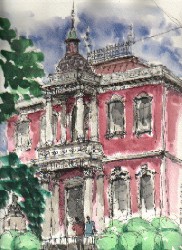 1917年(大正6年)に建てられた中島医院。赤紫色の外壁、アーチ型の装飾のある窓、正面のドーム、4本のコリント風の柱等、県北に残る代表的な洋風建築であり、大正期の貴重な作品である。 津山でのスケッチ会の時、6人一緒に前の道路端にすわり込んでスケッチを行う。