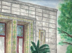 飛鳥山にひっそりたたずむ青淵文庫は、渋沢栄一80歳のお祝いと子爵への昇格のお祝いをかねて龍門社から寄贈されました。タイルに渋沢家の家紋「丸に違い柏」、ステンドグラスに「柏」・「寿」、龍門社にちなんで「龍」がデザインされているのもお洒落です。 遠くから眺めるのもいいですが、近くに寄っても楽しいです。青々とした芝生に足を投げ出してスケッチするのは、とても気持ちよかったです。 |