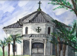 今回、この展覧会の為にスケッチに行ったのは、梅雨入り前の快晴の日だった。建築史の課題でスケッチに来た時は、寒風吹きすさぶ冬の日だった。 季節が変わると、周囲の緑も、空の青さも日射しの強さも全く違ってくる。 建物自身の表情も違って見える。多分、描き手の私の気分も違っている為だろう。明るい光を意識した絵になったと思う。 この建物は、北上川の中州に移築されているのだが、隣接地には、石ノ森章太郎デザインによる まんが館 が建設中である。 明治の建物と、平成の建物が果たして調和するものか、心配しているのは私だけだろうか。宇宙船をモチーフにした卵型のモダンな建物と、教会がどんなハーモニーを奏でるか 来年答えは出る。 |