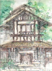 松坂屋を創業した伊藤家の15代目次郎左衛門祐民の別荘・揚輝荘内にある山荘風の洋館。 緑に囲まれた玄関には、美しい装飾のある枠に重厚な一木から作られた扉がはまっています。 所有者である伊藤家の好意で、いろいろな催しに公開される機会のある機会のあるこの建物で、私は多くの出会いを持つことができました。 なんとか残ってほしいものだと祈っています。