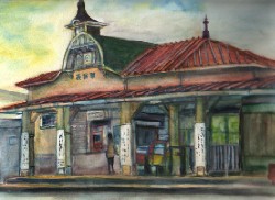 明治39年簡易駅舎として設けられ 同43年に現在の駅舎に改築された。二つの尖塔と赤屋根の駅舎は 明治ロマンのハイカラさを今も漂わせ 人目を楽しませている。 以前はつつじの花見時には 臨時列車が出たほど賑わったそうだが 今はひっそりとしている。絵を描いていると先生に引率された小学生達が駅に降り立った。一気に駅は活気付く。大阪府立青少年海洋センターでの宿泊学習にきたらしい。ヨットハーバーのある浜辺に出ると 明治以来の駅とは対照的に最新の関西国際空港が眺められる。 この駅もまた 時代時代に多くの人々の生活を見てきたのだろう。