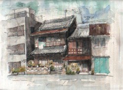 この建ものの最寄り駅は鶯谷、生活圏は根岸になります。根岸といえば下町情緒で有名ですが、木造長屋はそれほど多くありません。運よく震災と戦災からまぬがれても開発の手が伸びてきて、大通りから順に大きなビルに変わっていきました。出桁が見事なこの古びた町家は、路地を渡り歩いた奥に肩を寄せあって並んでいます。近所の方のお話だと、たぶん大正期からあったのではないかと思います。 |