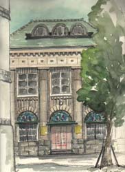 元第一合同銀行倉敷支店として建てられ、昭和3年の合併により、中国銀行となった。 倉敷のえびす通りのアーケードを抜けた、美観地区の象徴的とも言える大原美術館の すぐ北に位置するこの建物は、デンティルのコーニス、一階窓上部のファンライトのス テンドグラスが美しいルネッサンス風の近代建築である。