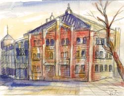 私の卒制のテーマ「時」の背景に建築史で学んだ赤レンガ倉庫を描いた。関東大震災や、第二次世界大戦の破壊を何とか免れ、百年近くの歳月を経て悠久と佇む。来年完成を目指し、MM(みなとみらい)のシンボルとして、文科系や、商業系施設をとして生れ変わる。そんな時代の流れや、感動的な人生で私もありたいと思う。工事中で塀や、トラックが行き交いスケッチが出来ず、以前のものを描き直したので、次回再び活気の戻った倉庫を描くことを楽しみに! |