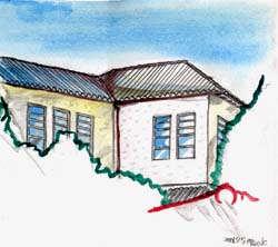 スケッチをしていると、通りかかった人が「壊されるんやてなあ、だから描いてんねんやろ」。その通り。この絵が展示される頃には、すでに失われている建物。残念。今回急遽スケッチした。大林組住宅部の設計施工で、昭和3年に建てられた。大林組住宅部は、武田五一の愛弟子松本儀八によって率いられており、スパニッシュをよく取り入れていた。庭は、橋本八重三の手による。戦後接収にあった建物でもあり、その視点でも興味ある建物だった。 |