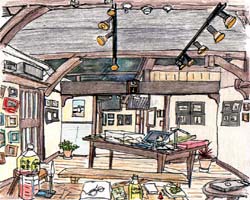 アユミギャラリーの内部である。自分の個展を開いている間にスケッチを始めた。目は近場の雑物から一つずつ遠くへと流れ、右が飽きれば左に向かい、遠近法も奥行きも感情もない。ひたすら物体が折り重なる真実を追って進み、全体のすべてを描いたことによって終わる。「やっつけた」という感情が湧いてくる。色をつけていくと次第に全体の事実がみえてくる。スケッチのデキはどうであれ、いい建築を今日も食べれたと自分を慰める。 |
